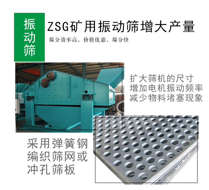 擴(kuò)大篩機(jī)的尺寸、增加電機(jī)振動(dòng)頻率,采用彈簧鋼編織篩網(wǎng)或沖孔篩板,使篩箱振動(dòng)強(qiáng)烈,減少物料堵塞篩孔現(xiàn)象的同時(shí)使篩機(jī)具有較高的篩分效率和生產(chǎn)率,這樣就增加了zsg礦用重型振動(dòng)篩增大產(chǎn)量。