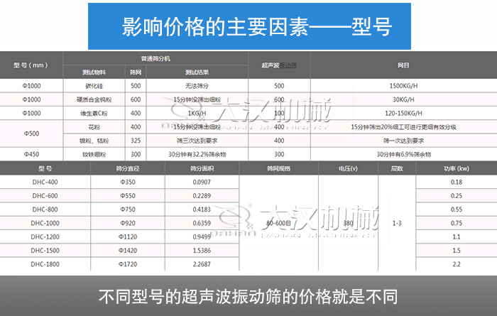 超聲波振動(dòng)篩型號(hào)有:DHC-400、DHC-600、DHC-800、DHC-1000、DHC-1200、DHC-1500、DHC-1800、DHC-2000等八種標(biāo)準(zhǔn)直徑型號(hào);不同型號(hào)的超聲波振動(dòng)篩的價(jià)格就是不同,其中影響型號(hào)的的因素有:篩網(wǎng)(1—5層)、材質(zhì)(不銹鋼、碳鋼)、振動(dòng)電機(jī)(功率不同)等。