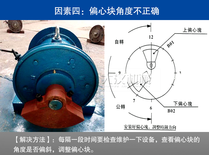 【解決方法】:每隔一段時間要檢查維護一下設(shè)備,查看偏心塊的角度是否偏斜,調(diào)整偏心塊。