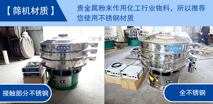 【篩機材質】—— 貴金屬粉末作用化工行業(yè)物料,所以推薦您使用不銹鋼材質,而常用的不銹鋼超聲波振動篩分為兩種結構,一種是整機均采用不銹鋼制成,另一種是與物料接觸不分為不銹鋼材質,底座為碳鋼材質,至于如何選擇就看您對衛(wèi)生環(huán)境的要求以及成本預算了。