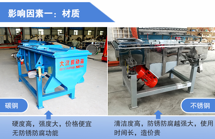 直線篩材質(zhì)分為碳鋼和不銹鋼兩種,碳鋼材質(zhì)(如:Q235)它的硬度高,強度大,價格便宜,是多行業(yè)常用的材質(zhì),但是它沒有防銹防腐功能,所以對于衛(wèi)生環(huán)境要求較高的就推薦您使用不銹鋼材質(zhì)(如:304)它的材質(zhì)清潔度高,防銹防腐越強大,不會污染物料,使用時間長,造價也相對高,所以在夠買的時候您也要根據(jù)成本預(yù)算來進行選擇。