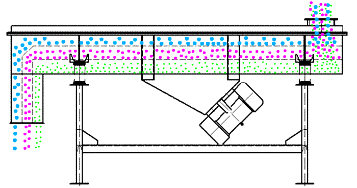 食品直線振動篩采用雙激振器驅動,兩臺激振器做同步、反向旋轉時,其偏心塊所產(chǎn)生的激振力在平行于電機軸線的方向相互抵消,在垂直于電機軸的方向疊為一合力,因此篩機的運動軌跡為一直線。其兩電機軸相對篩面有一傾角,在激振力和物料自重力的合力作用下,物料在篩面上被拋起跳躍式向前作直線運動,從而達到對物料進行篩選和分級的目的。